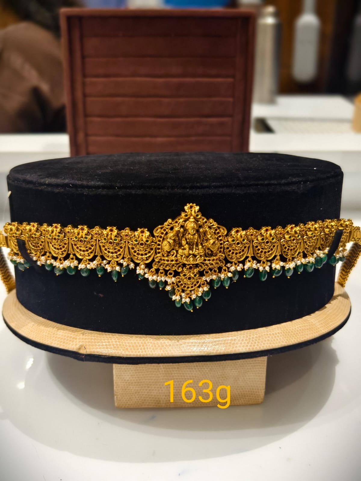 - Embellished with pearl clusters and green semi-precious bead drops